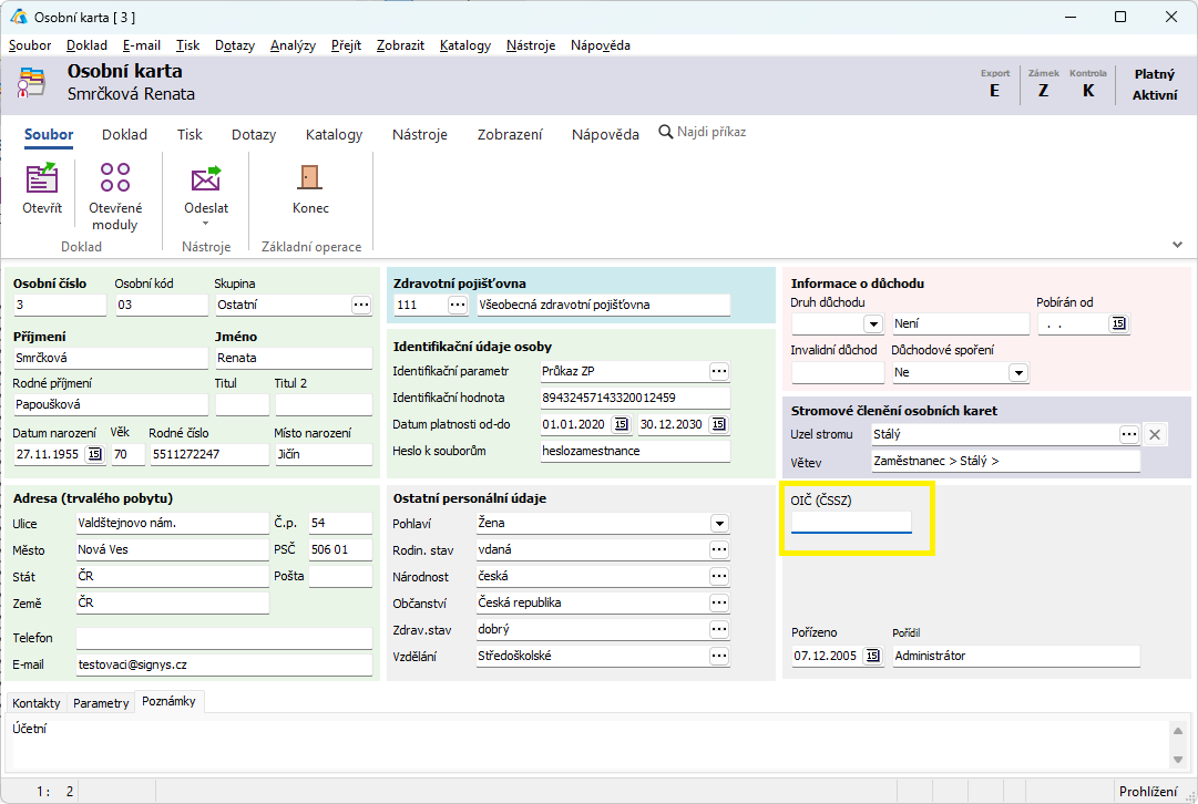 Jedná se o nový, unikátní a neměnný numerický identifikátor fyzické osoby používaný v systémech MPSV a ČSSZ od 1. 4. 2026. Nahrazuje rodné číslo pro účely identifikace zaměstnance, přičemž je přenosné mezi zaměstnavateli a přiděluje se pouze jednou za život. Z OIČ nelze odvodit datum narození ani pohlaví.